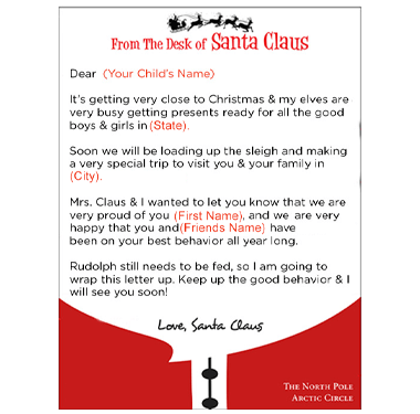 A personalized letter from Santa sent directly to your child. The letter is postmarked from the North Pole and Signed by Santa. Each child receives a unique letter from Santa